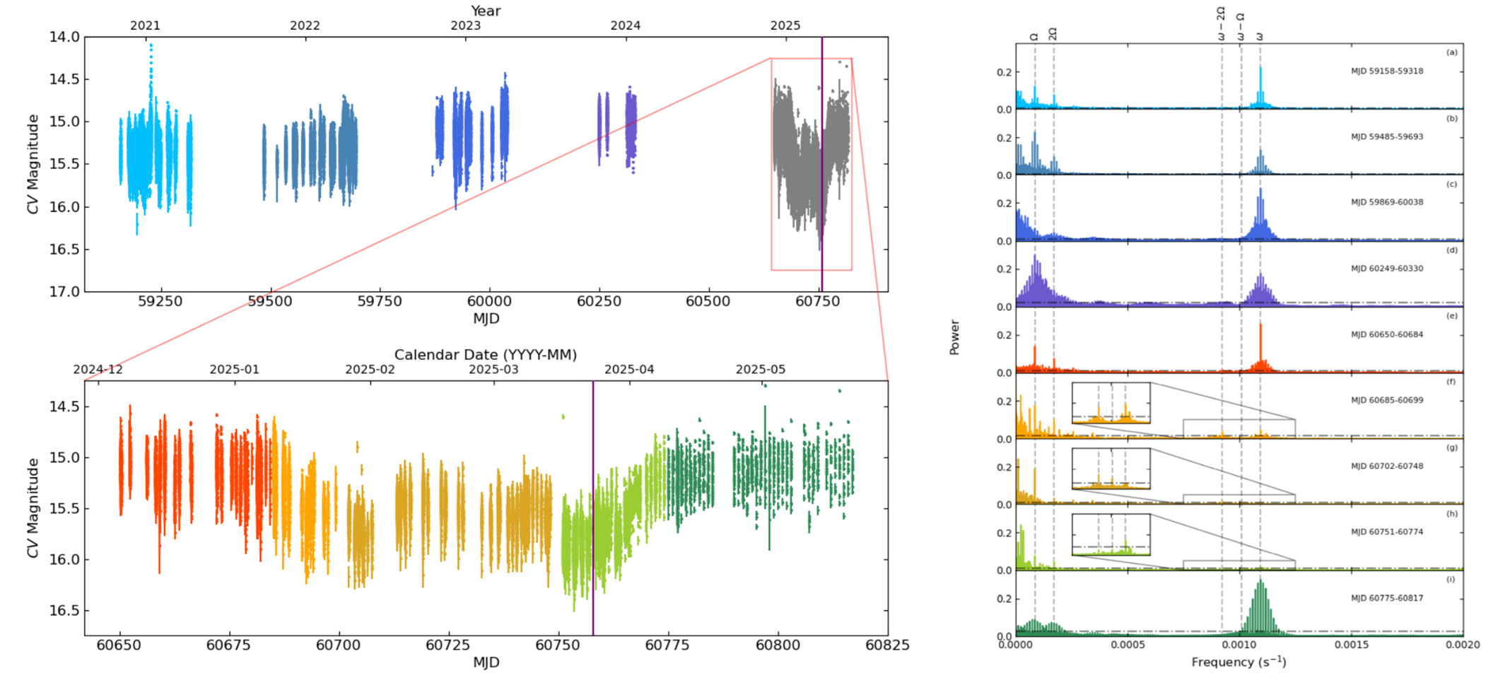 Obr.1 Dlhodobá svetelná krivka BG CMi z dát AAVSO (vľavo). Spodný panel znázorňuje pokles na začiatku roka. Periodogramy z nočných časových radov tiež z dát AAVSO (vpravo). Prebraté z pripravovanej publikácie A. W. Shaw et al., „A multi-wavelength study of the 2025 low state of the intermediate polar BG CMi“.