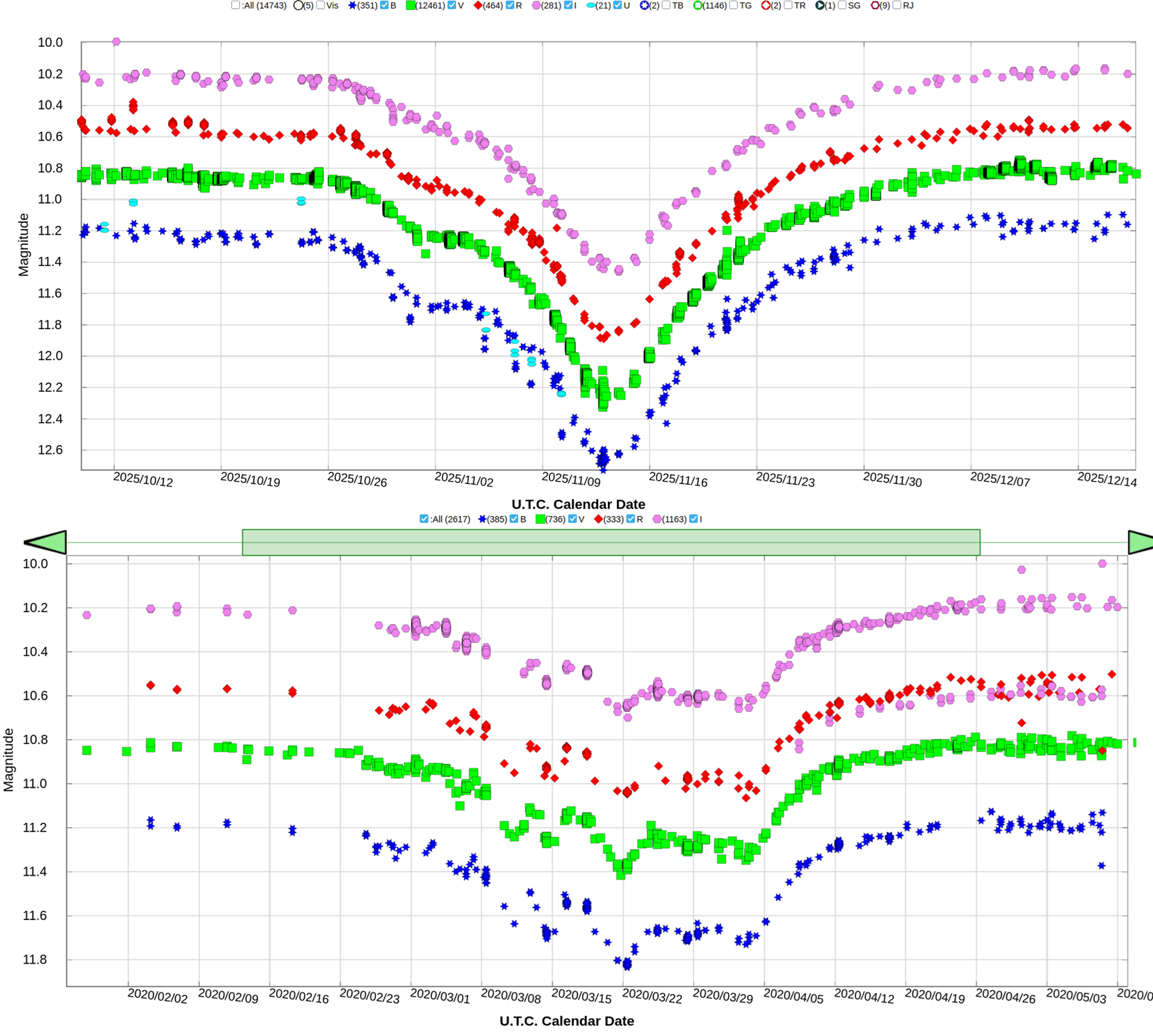 Obr. 5 Svetelné krivky dvoch posledných zákrytov EE Cep z databázy AAVSO.
