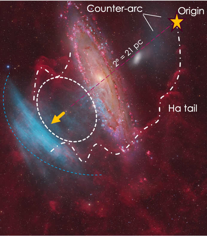 Obr. 4 Skica popisujúca vznik ghost planetary nebula pri EG And. Galaxia M 31 sa náhodne premieta na pozadie. Obrázok prebratý z Ogle et al. 2025