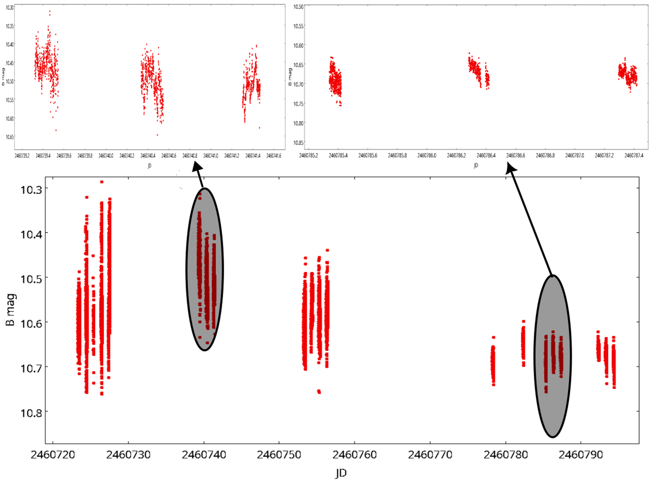 Obr.2 Časové rady RW Sex získané na observatóriách HaPMRS v Hlohovci a na Kolonickom sedle. V hornom paneli je detailný pohľad na svetelné krivky v stave zvýšenej (vľavo) a zníženej jasnosti (vpravo). Škála na ypsilonovej osi je rovnaká.