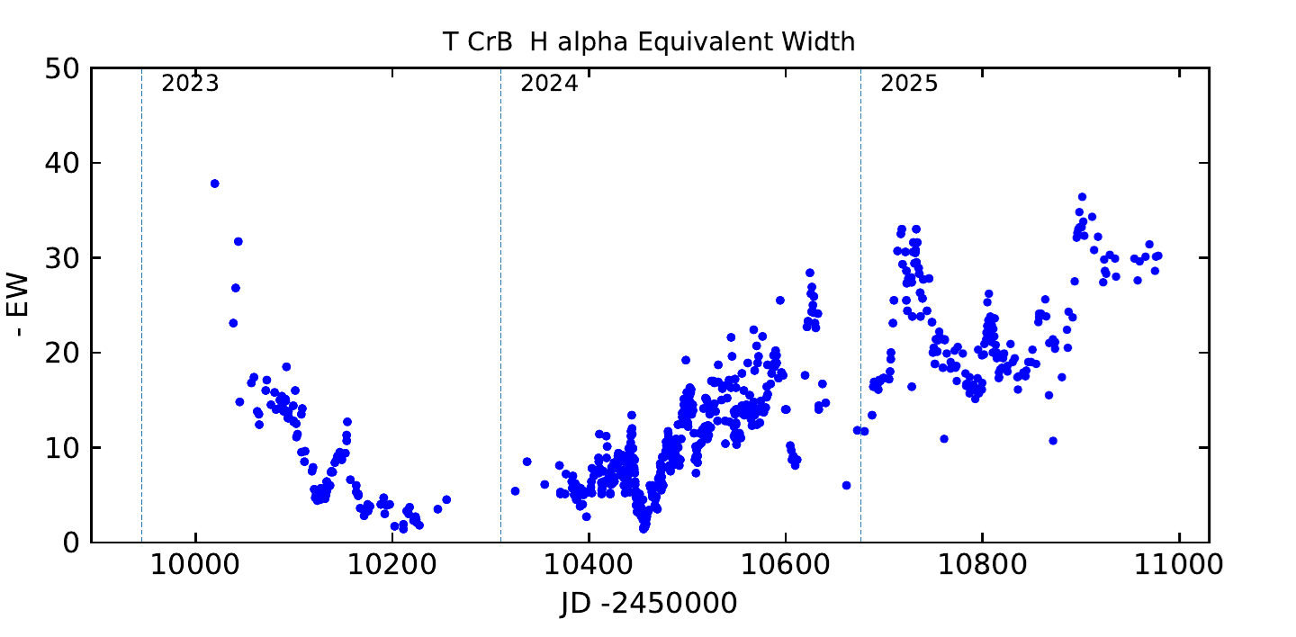 Rekurentná symbiotická nova T CrB (vzplanutia v rokoch: 1786?, 1866, 1946, ?) môže vybuchnúť hocikedy. Všetky doterajšie predikcie zlyhali. Aktívna fáza, ktorá začala v roku 2015, skončila v apríli 2023. Jasnosť poklesla, emisné čiary prakticky vymizli, ostala len slabá Balmerova séria. V roku 2025 sa aktivita obnovila. Hrubú predstavu si môžeme urobiť meraním ekvivalentnej šírky čiary H-alfa (Obr. 3).