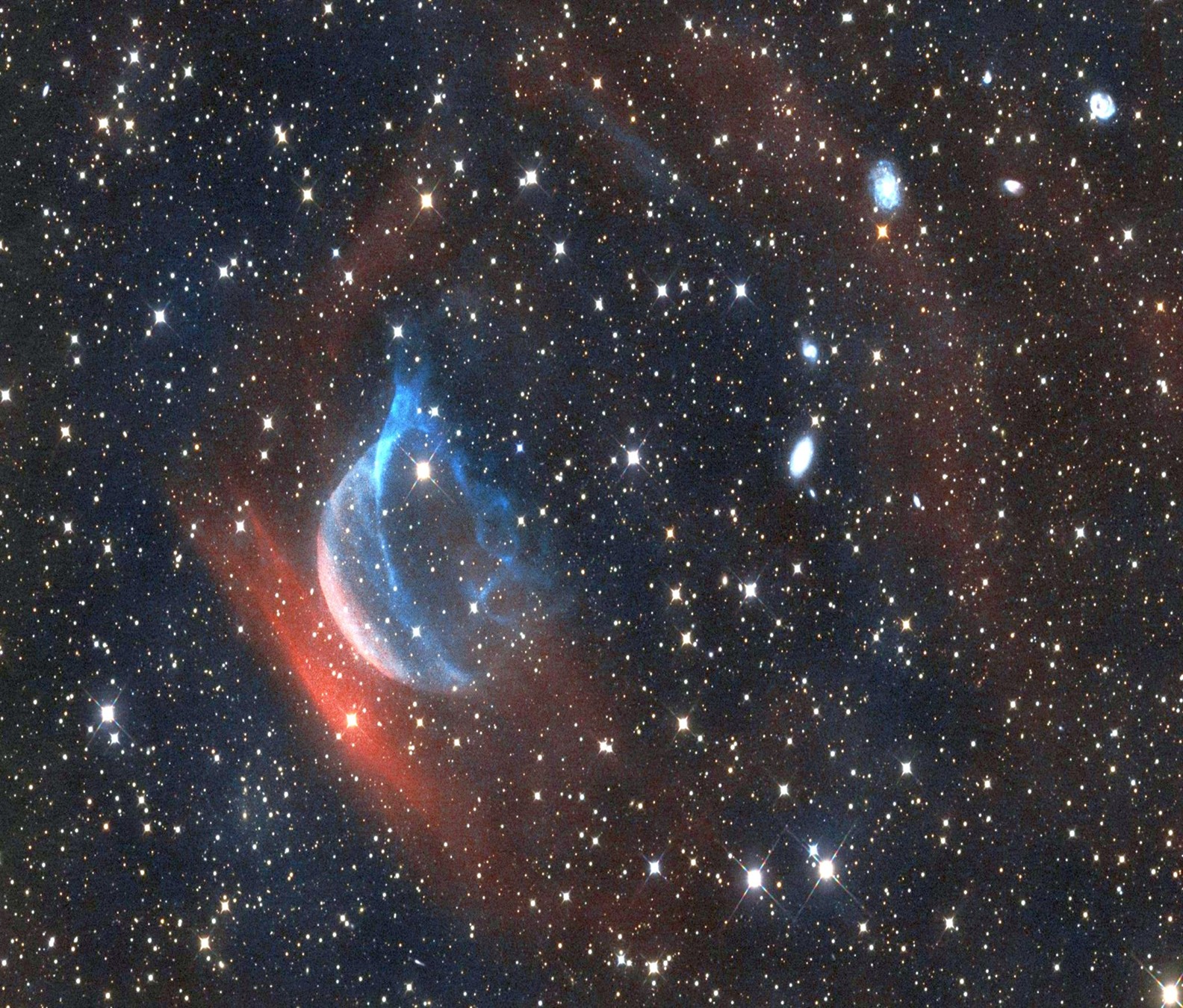 Obr. 7 Výsledok pilotnej kampane na zobrazenie obálok po výbuchoch novy Z Cam. Červená farba patrí emisii vodíka H-alfa, modrá emisii v zakázanej čiare kyslíka [OIII]. Autori snímok: R. Barsa, M. Gnida, K. Kolomazník, P. Kollárik, A. Kováč, M. Mančuška, D. Volný.